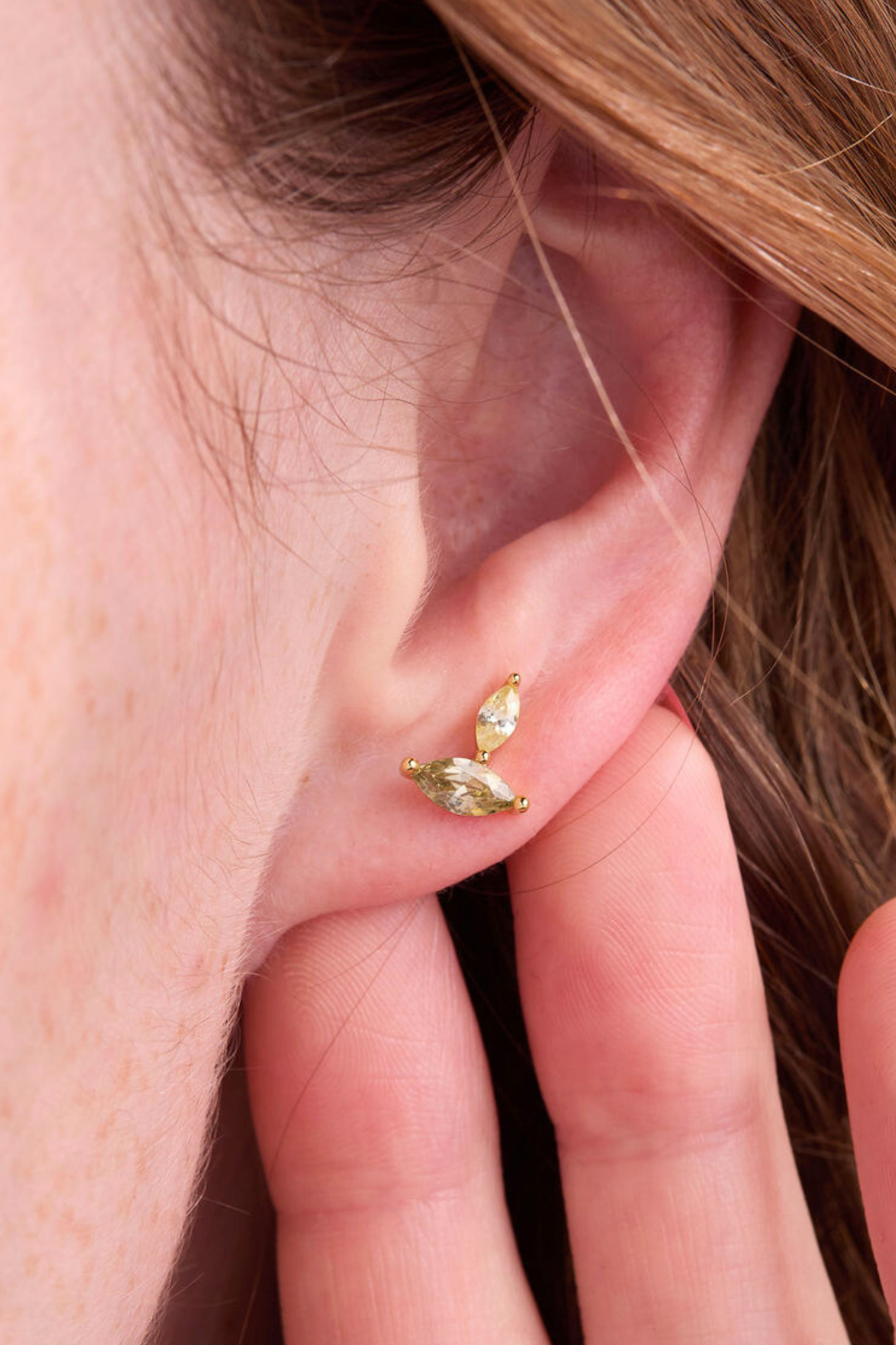 The Autumn Marquise Leaf Gold Studs pair a vibrant green peridot with a golden olive accent in a delicate marquise silhouette. Sitting gently on the ear, they reflect the first signs of fall—green, glowing, and cozy.