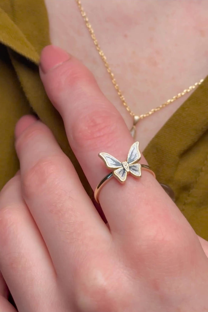 A bold yet delicate statement, this adjustable ring takes the form of a graceful butterfly, symbolizing transformation and freedom. The wings are accented with brushed blue enamel, adding a soft, artistic texture that enhances its ethereal beauty. This ring is designed to stand out while remaining effortlessly wearable. Its adjustable design ensures a perfect fit, making it a striking addition to any jewelry collection.