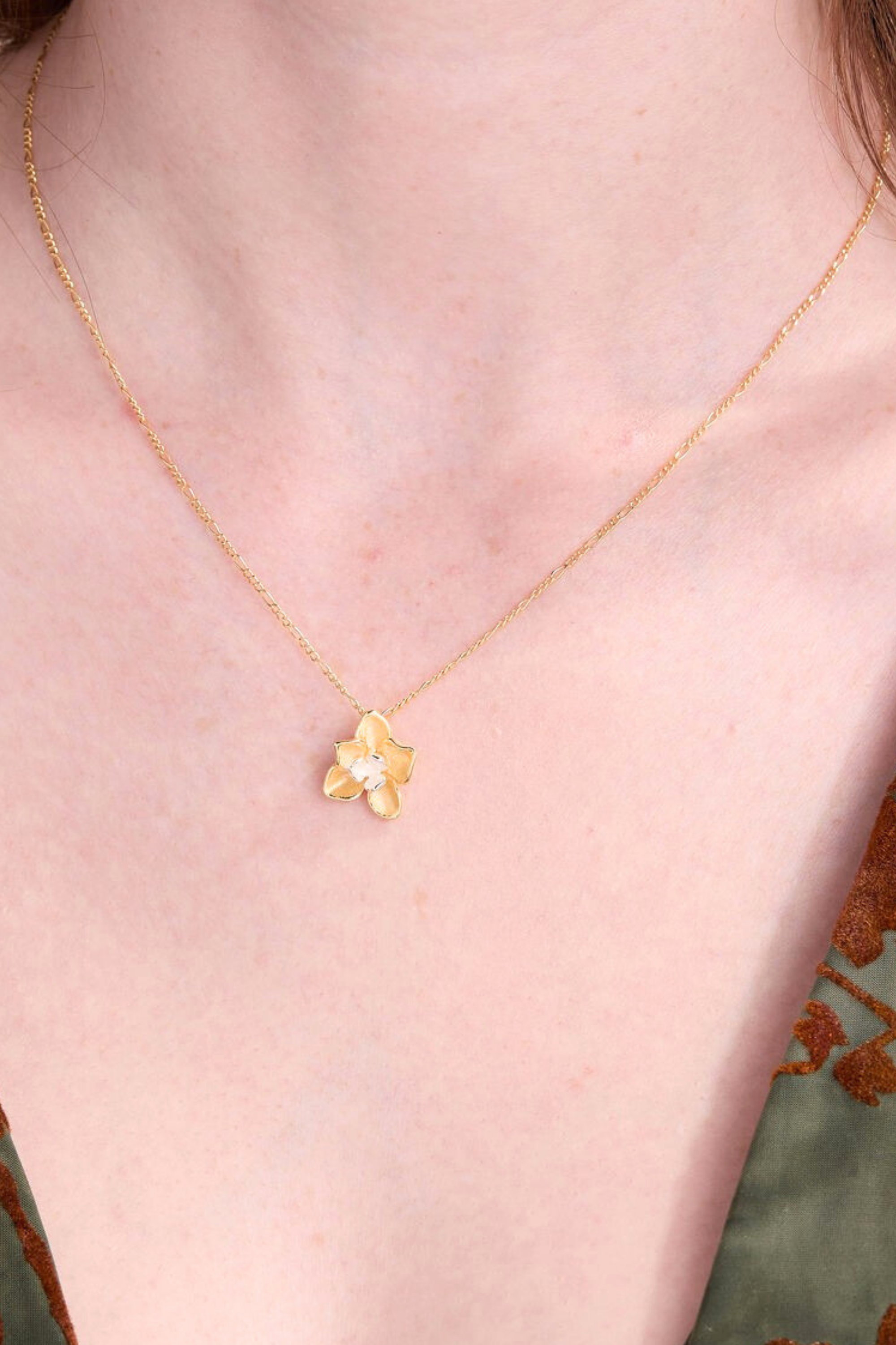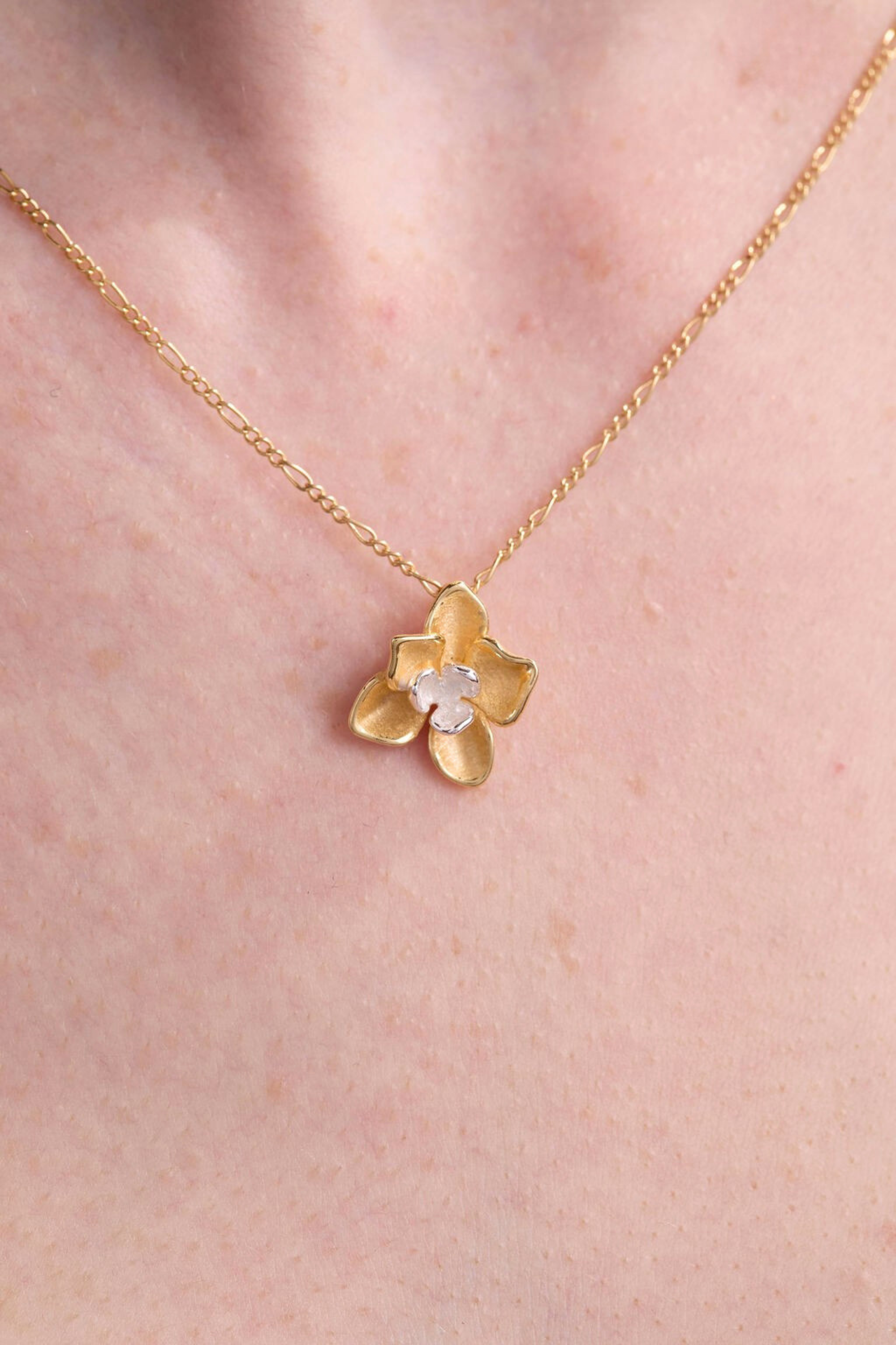 The Daffodil Gold Necklace features a radiant golden bloom with a bright silver center, suspended on a delicate gold chain. As the first flower to bloom each spring, the daffodil symbolizes new beginnings and fresh starts.