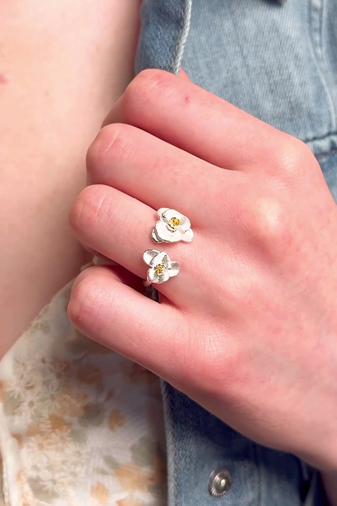The Orchid Silver Adjustable Ring brings a delicate sterling silver bloom to a slender silver band. Its petals, softly brushed, open to reveal a glossy golden center that catches the light like dew. This piece is a nod to the graceful beauty of the orchid.