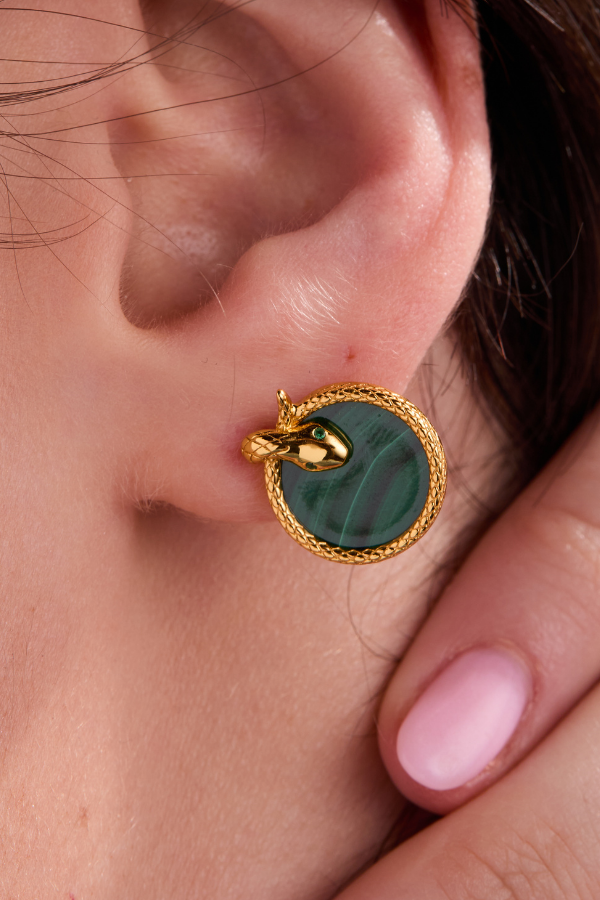 These captivating stud earrings feature a coiled snake embracing a circular malachite stone, creating a balance of strength and elegance. The rich green tones of malachite add a striking contrast to the intricate serpent detailing. Designed for effortless wear, these studs are a perfect blend of bold symbolism and refined beauty.